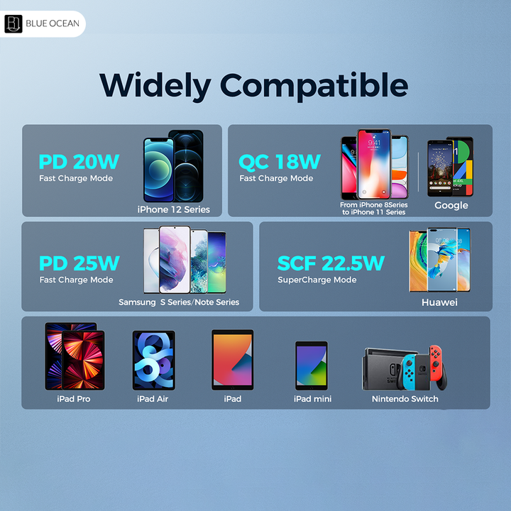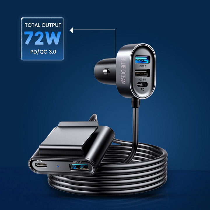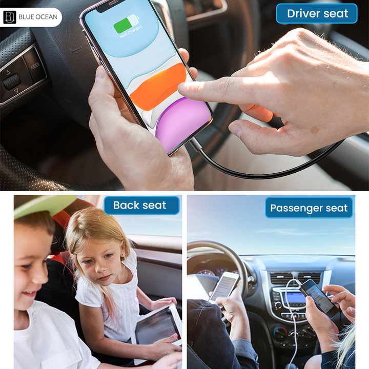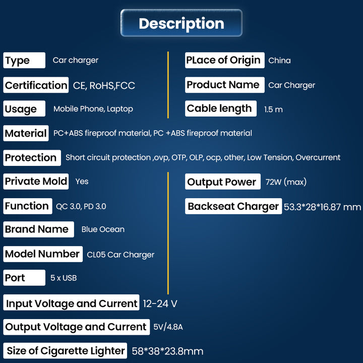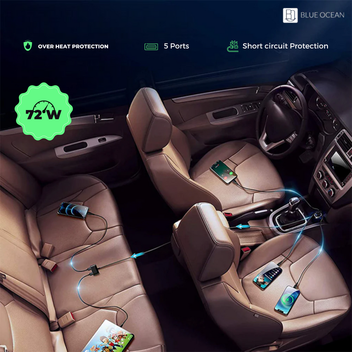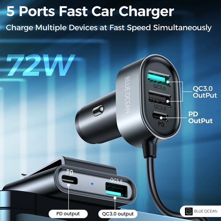 Blue Ocean Fast Car Charger 5 Multi Port Cigarette Lighter USB Adapter charges your multiple devices at the same time with this versatile, high-power USB charger. With a max output of 72W, it can charge up to 5 devices simultaneously at fast speed. Car charger adapter ports have built-in intelligent chip that can automatically identify any devices you plug in, optimized 80% charging efficiency, and promoted 90% charging stability than dual port car charger. It is designed for all USB-powered devices and is universal for 12-24V vehicles.